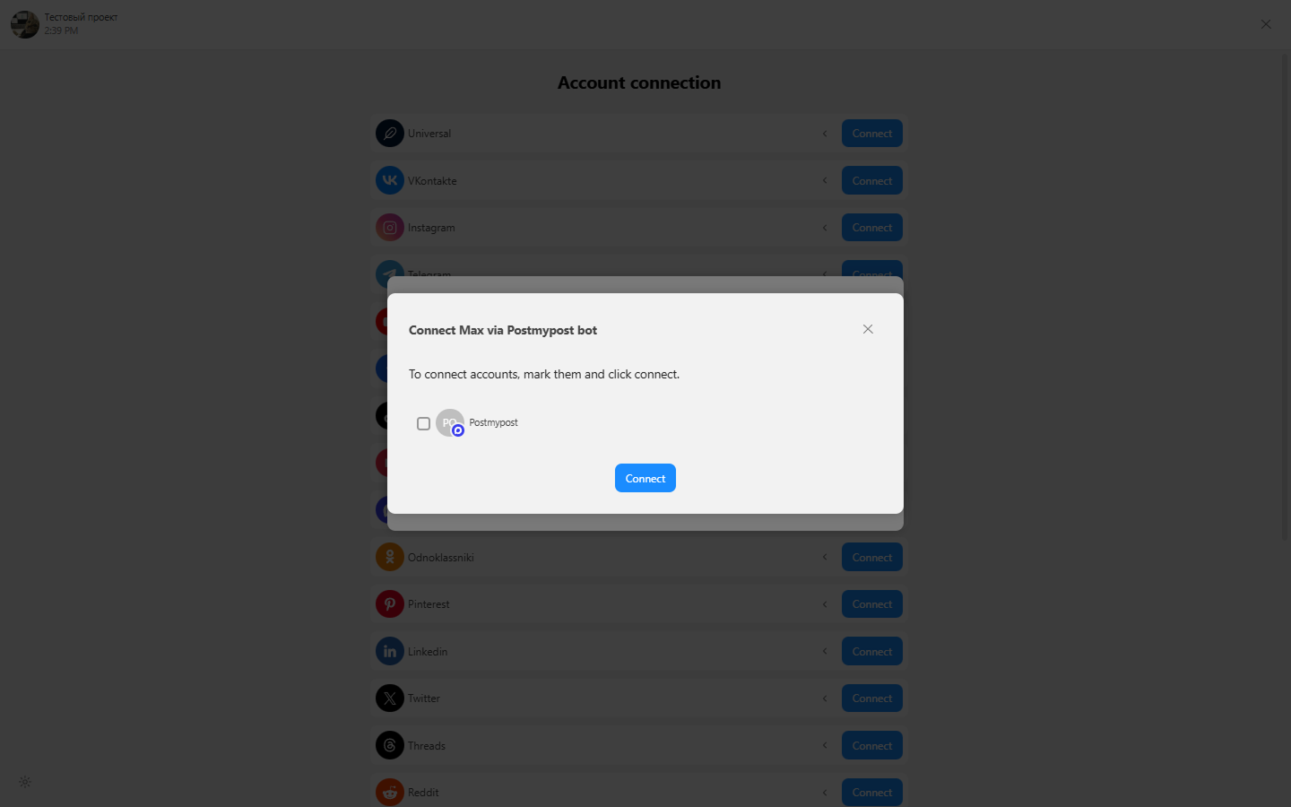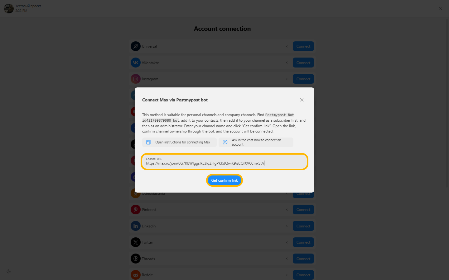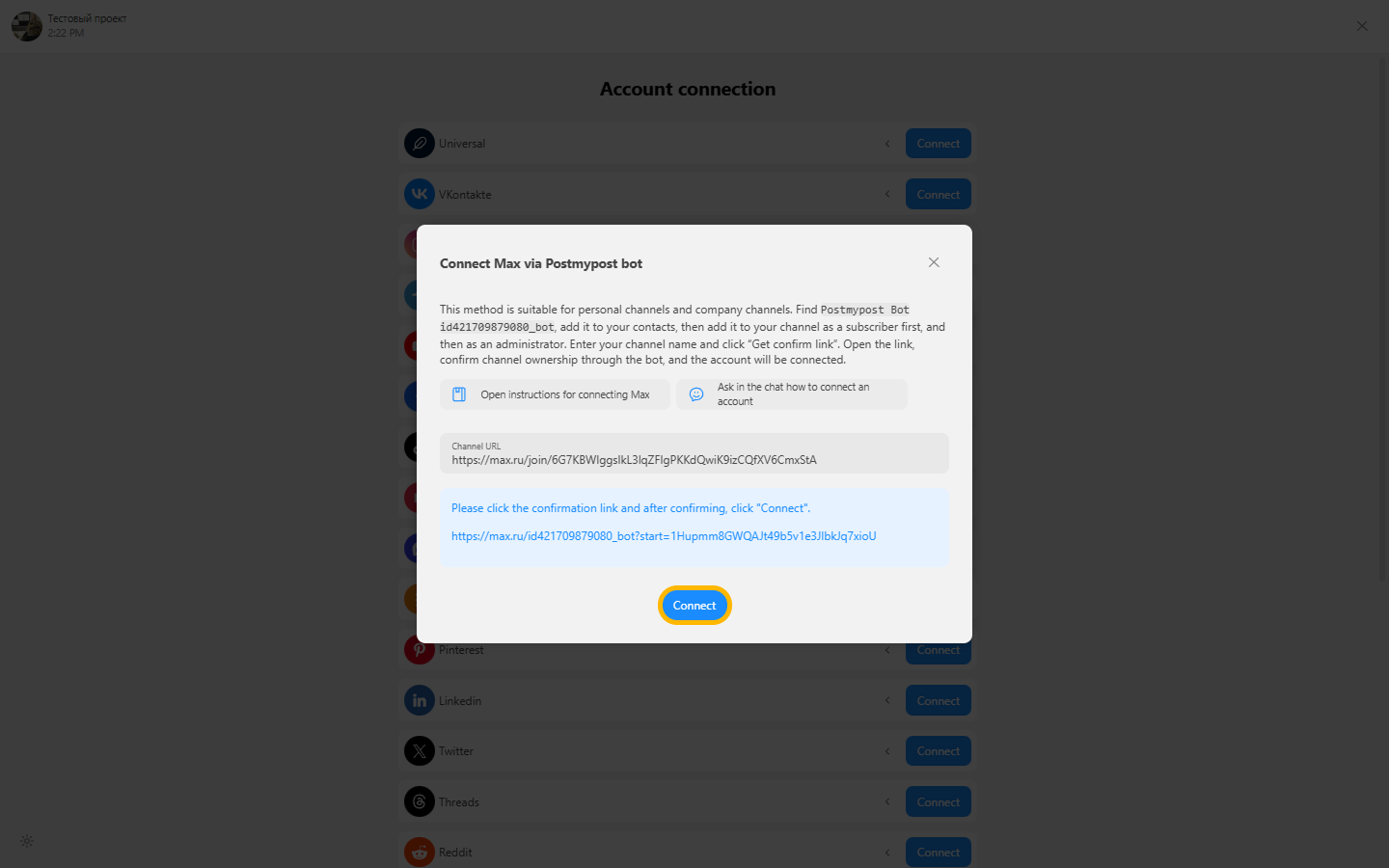 Follow these steps to connect your channel in MAX via the Postmypost bot.