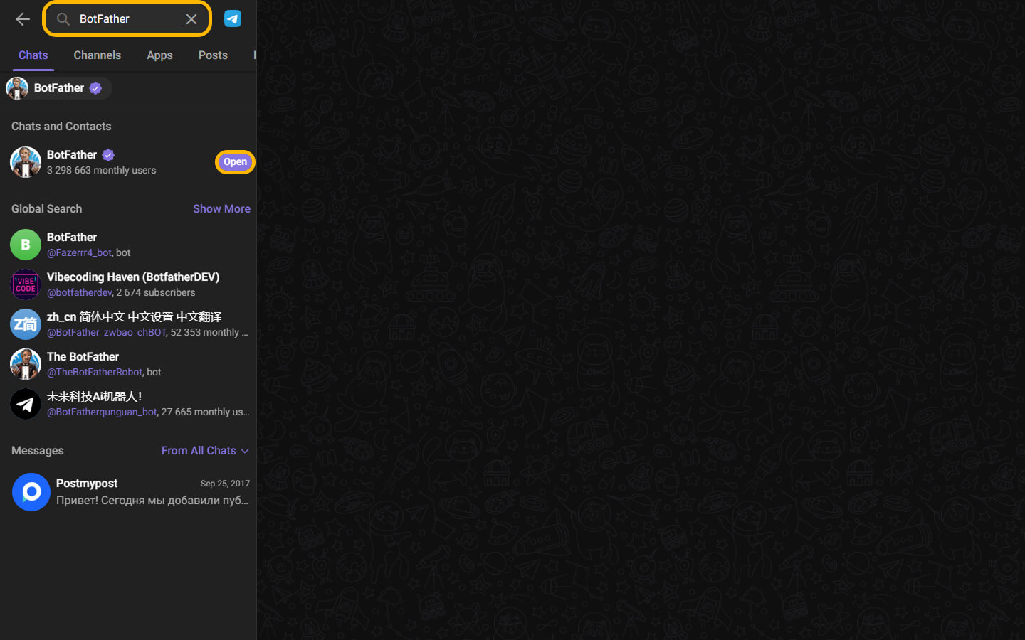 In the search field of the opened window, enter the bot's username you gave during creation,