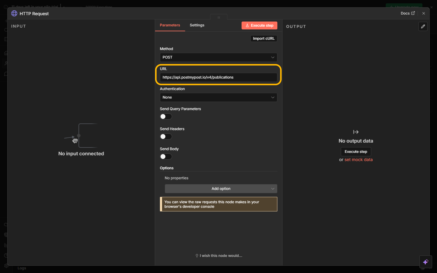 - Enter the URL: https://api.postmypost.io/v4/publications