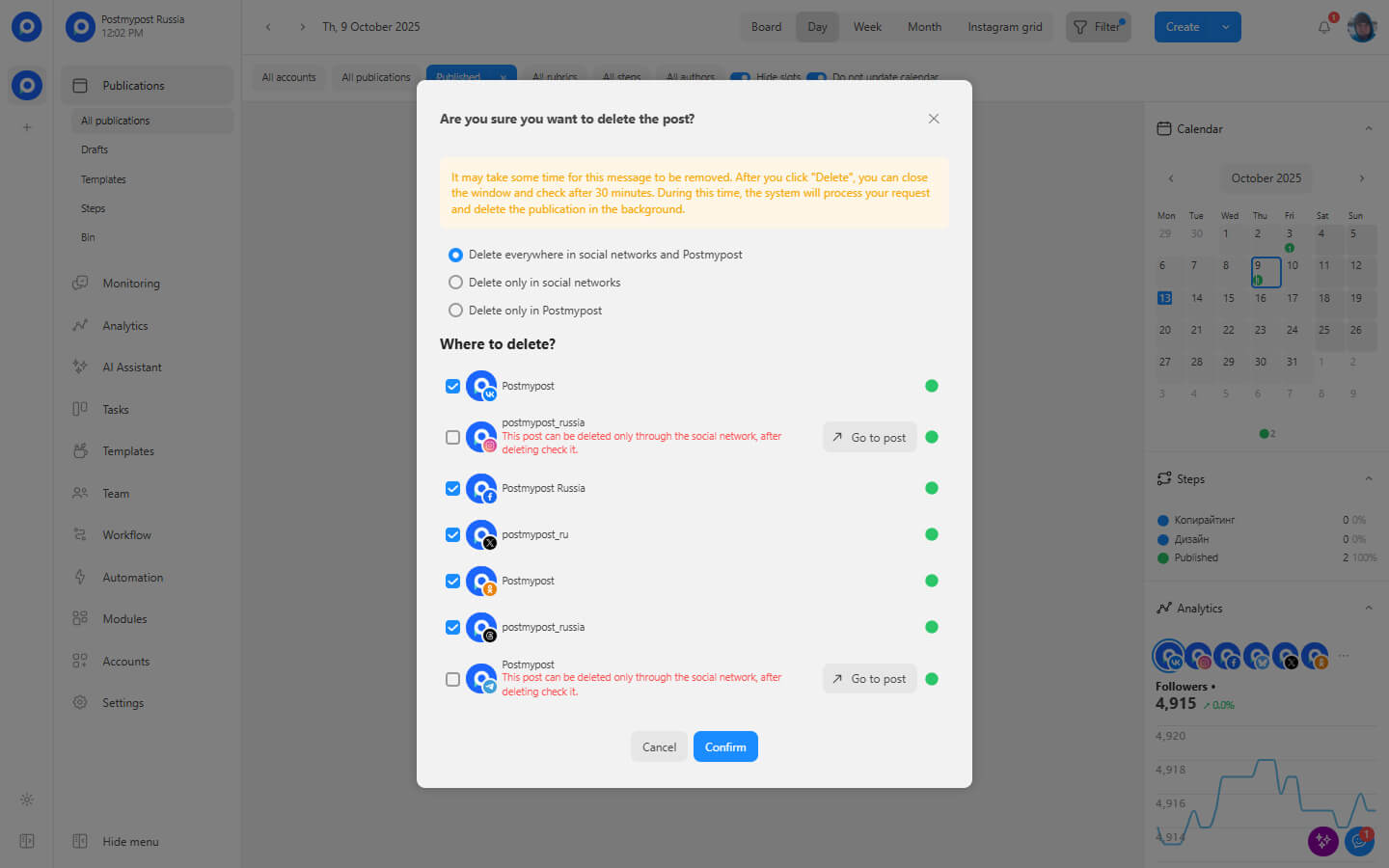 - Delete only from social networks (the post will remain in Postmypost)