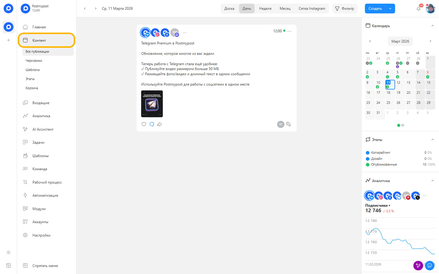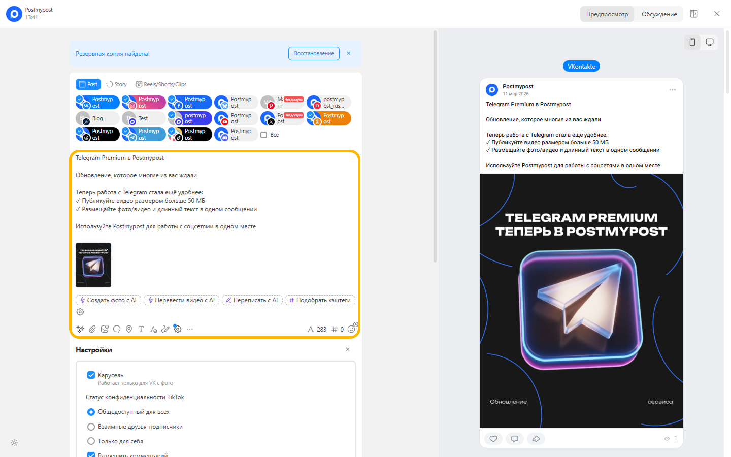 - Қосымша аккаунттар мен арналарды қосып, кросс‑жариялау жасаңыз.