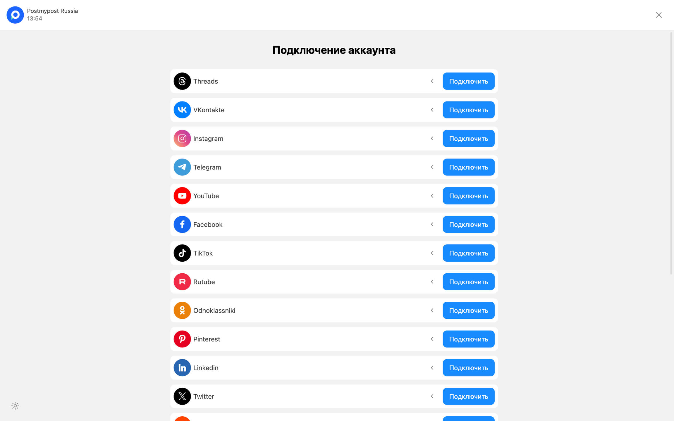 - Postmypost-тың «Аккаунттар» бөліміне өтіп, «Қосу» батырмасын басыңыз.