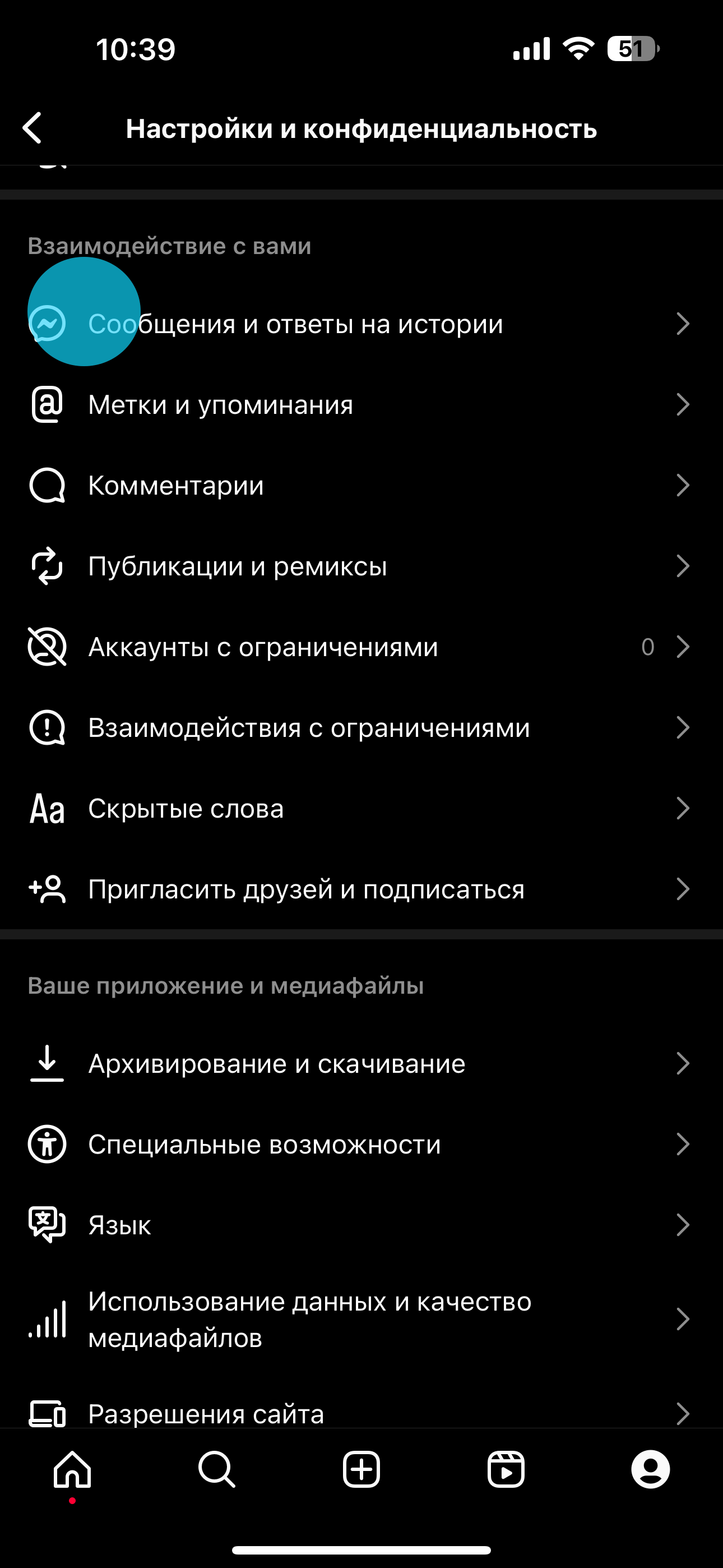 - Бетті төмен қарай айналдырып, «Хабарламалар және оқиға жауаптары» (Messages and Story Replies) бөлімін таңдаңыз және осы бөлімге кіріңіз.