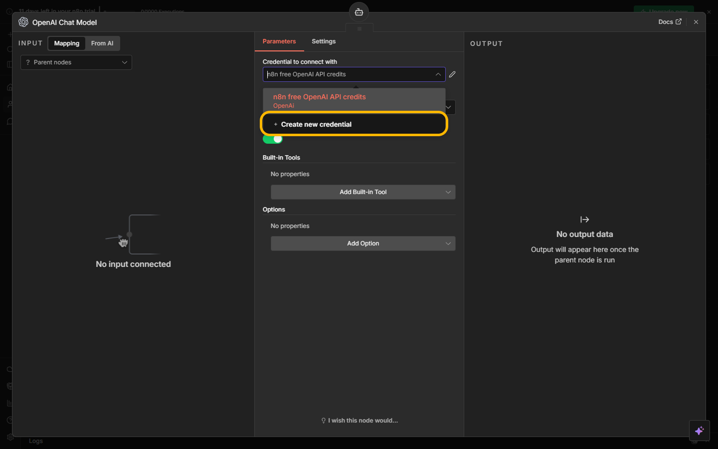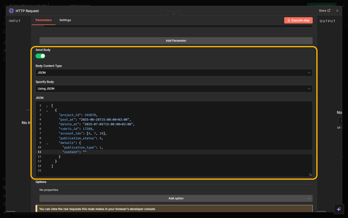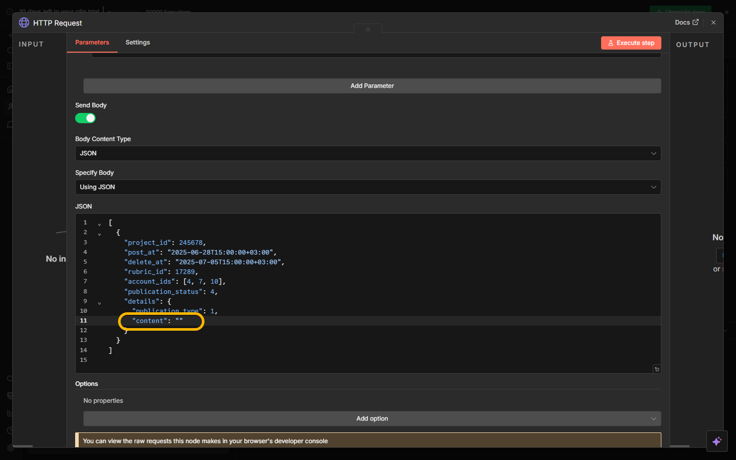 - content параметрі үшін нейрон желінің жұмыс нәтижесін қолданыңыз, автоматты түрде жасалған контентті жариялау үшін. Бұл "output" белгішесін қажетті параметрге сүйреу арқылы жасалады (маңызды: параметр тырнақшаға алу қажет).