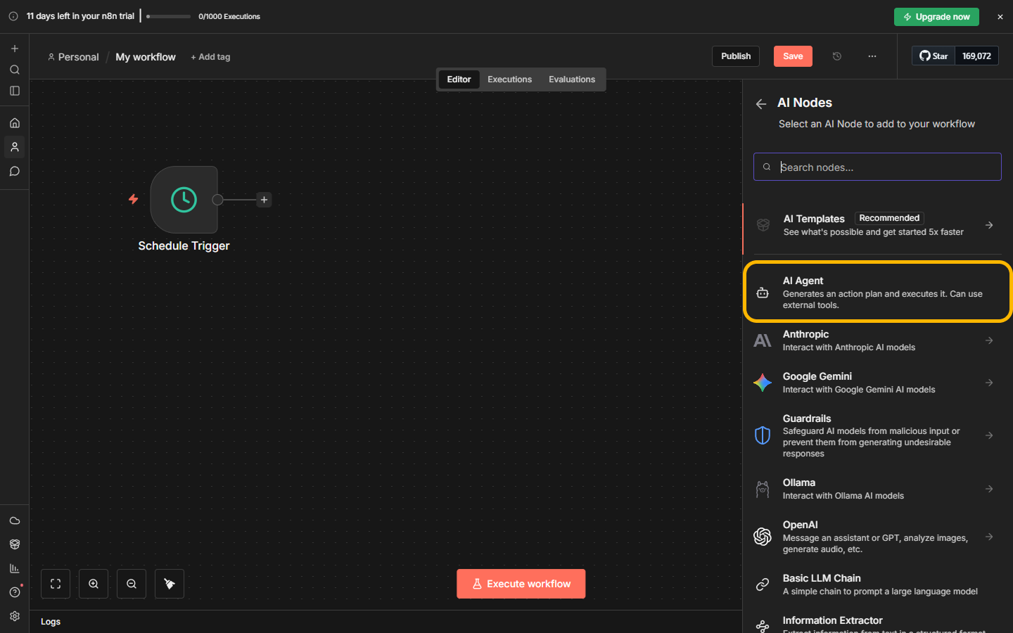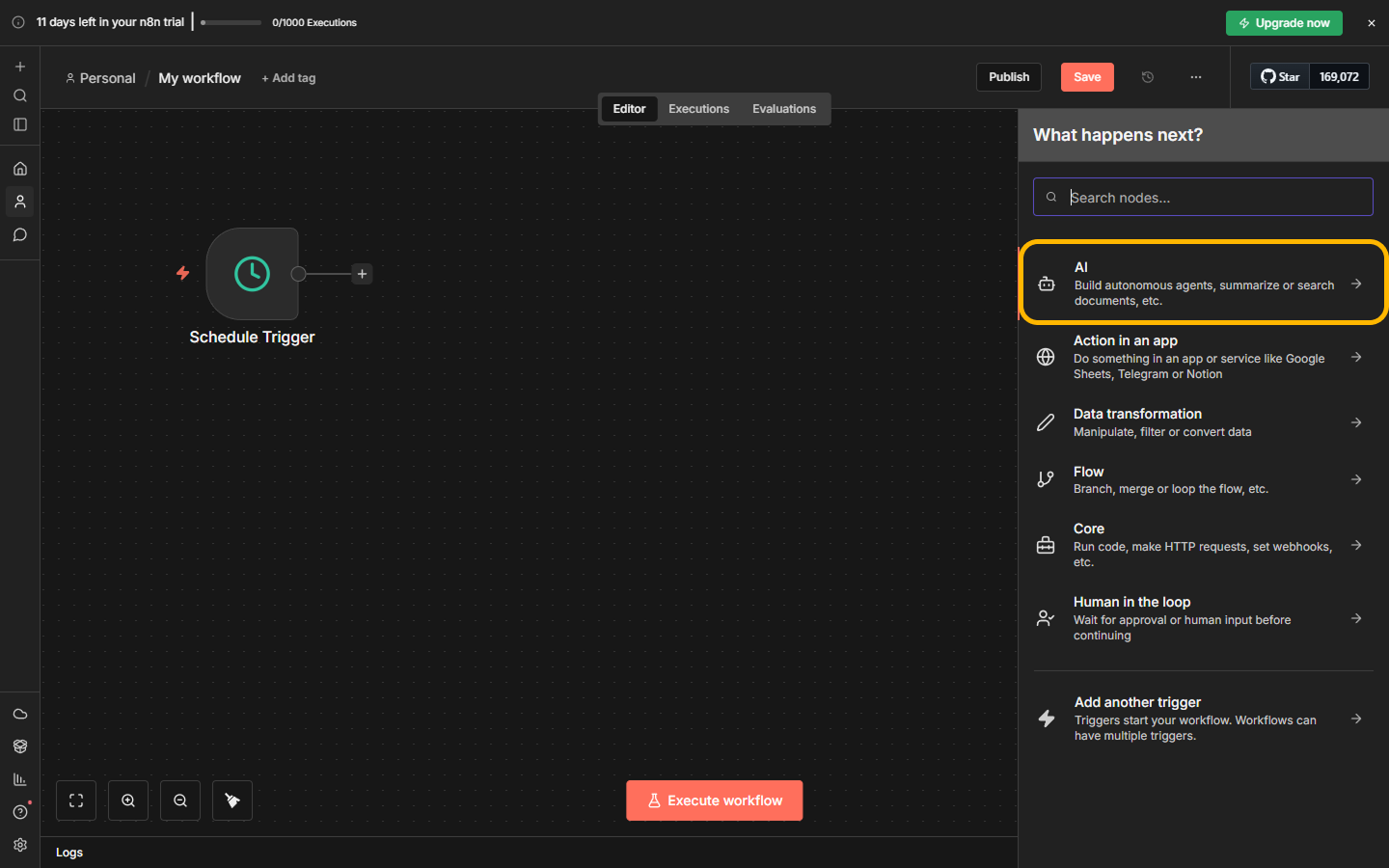 Сценарий қолмен, кесте бойынша немесе оқиға бойынша басталуы мүмкін — мысалы, жаңа хабарлама түскенде, жазба жасалғанда немесе webhook алынғанда. Іске қосылғаннан кейін, n8n барлық қадамдарды рет-ретімен орындайды және деректерді бір түйіннен екіншісіне береді.