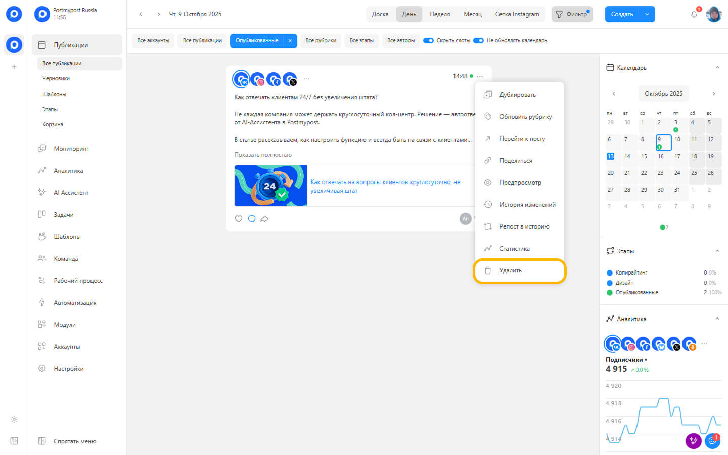 - Тек әлеуметтік желілерден жою (пост Postmypost-тен қалады)