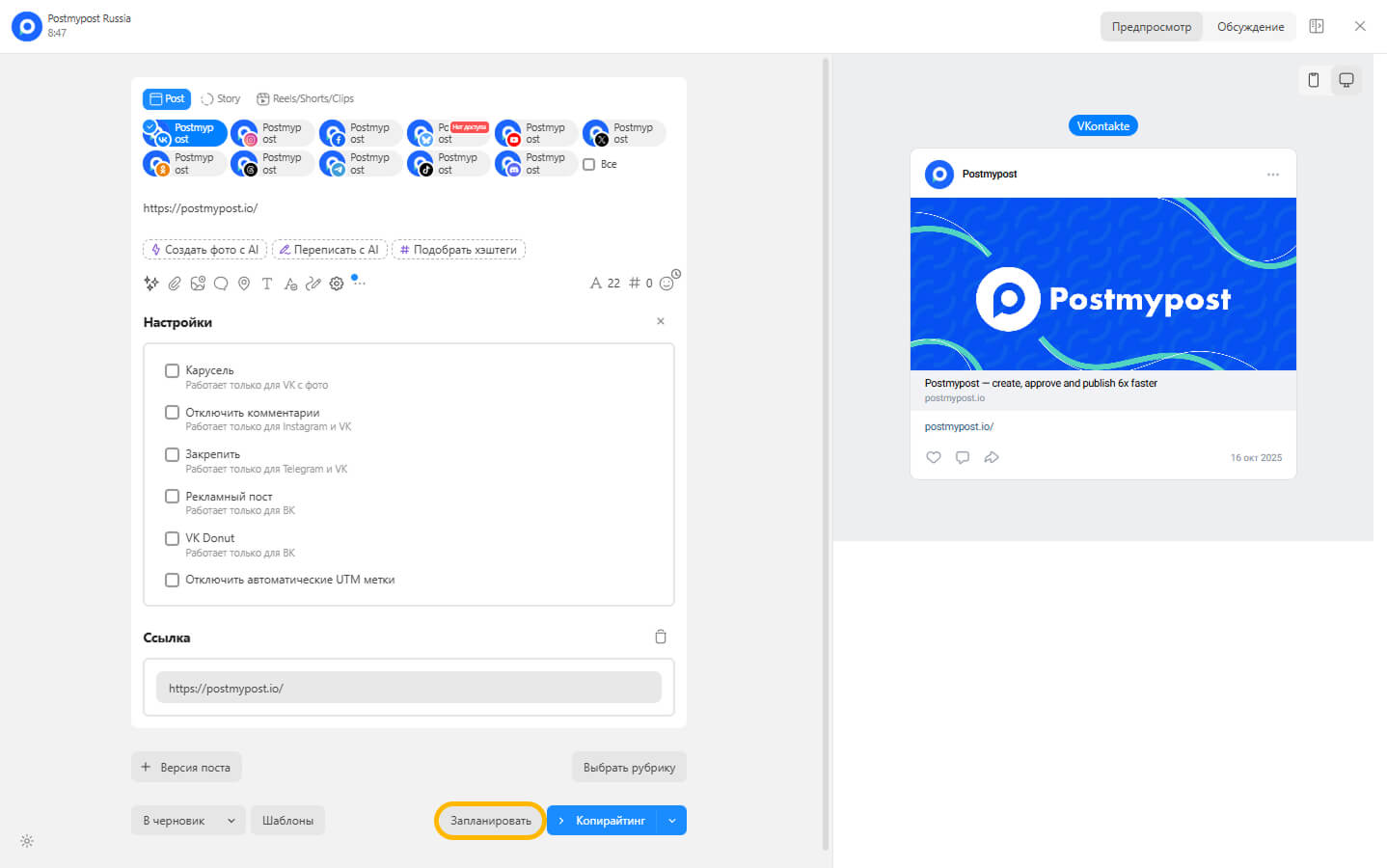 - Пост жасағанда «Жоспарлау» түймесін басыңыз