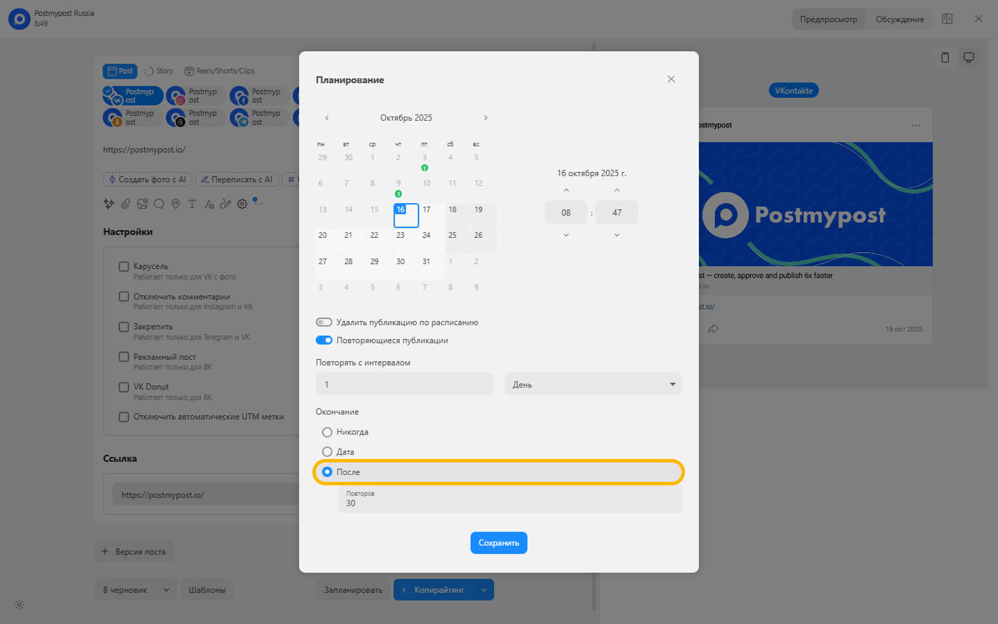 Қайталап жариялау берілген кесте бойынша контентті автоматты түрде жариялауға мүмкіндік береді, әр постты бөлек жасау қажеттілігінсіз.