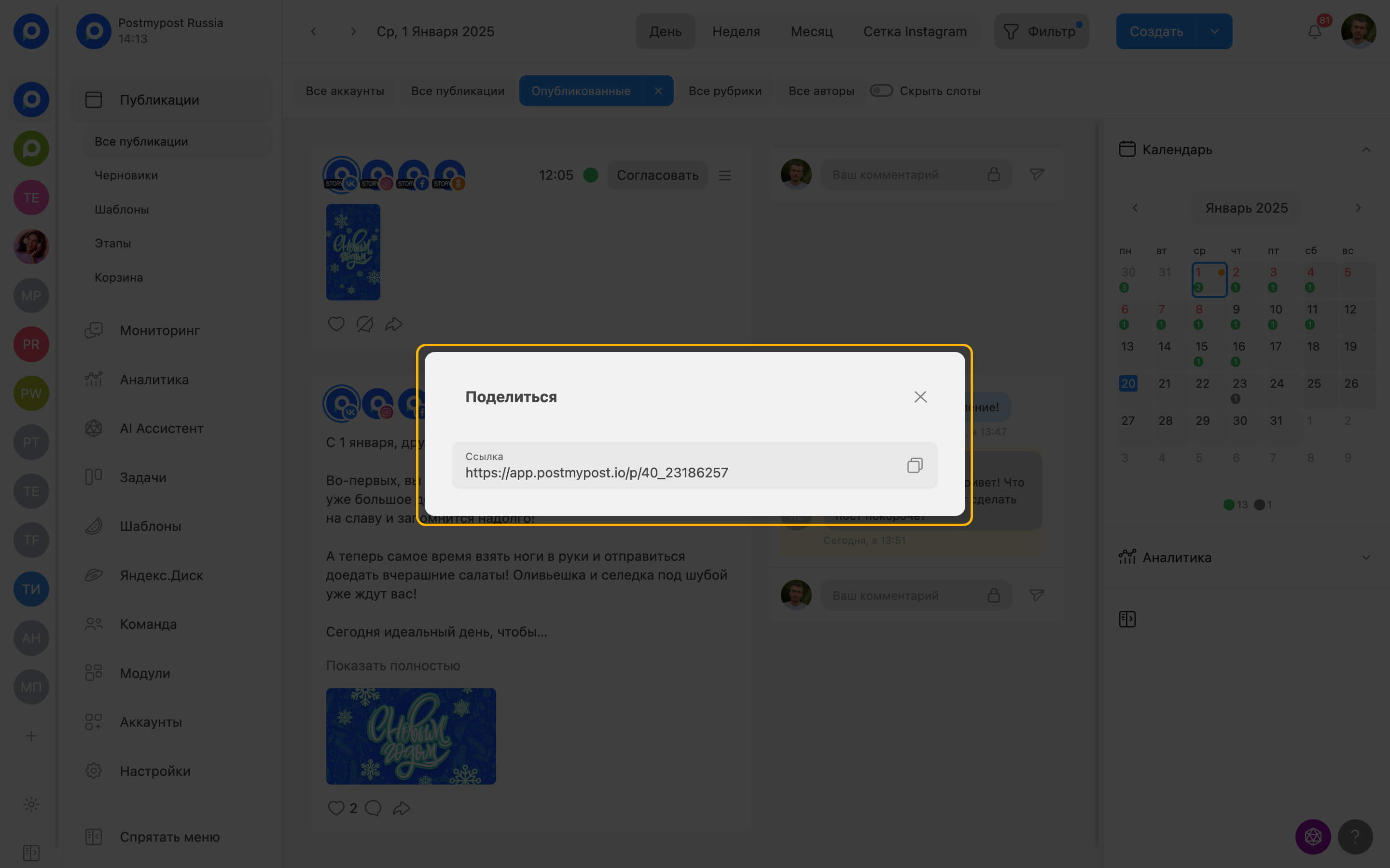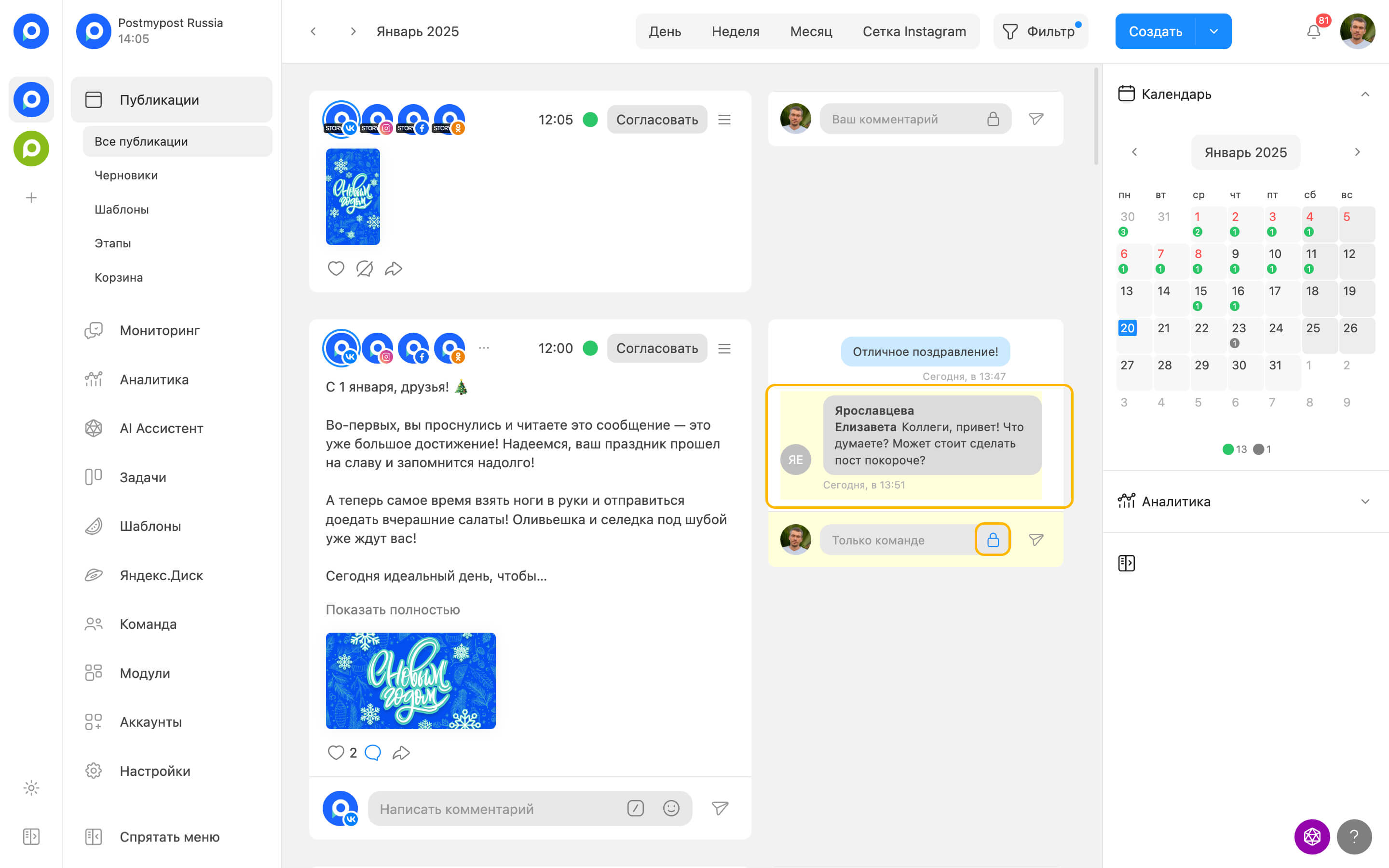 Әрбір постқа арналған барлық коммуникация бір жерде қолжетімді. SMM-менеджер мен клиент детальдарды талқылап, түзетулер енгізіп, контекстің жоғалмауын бақылай алады.