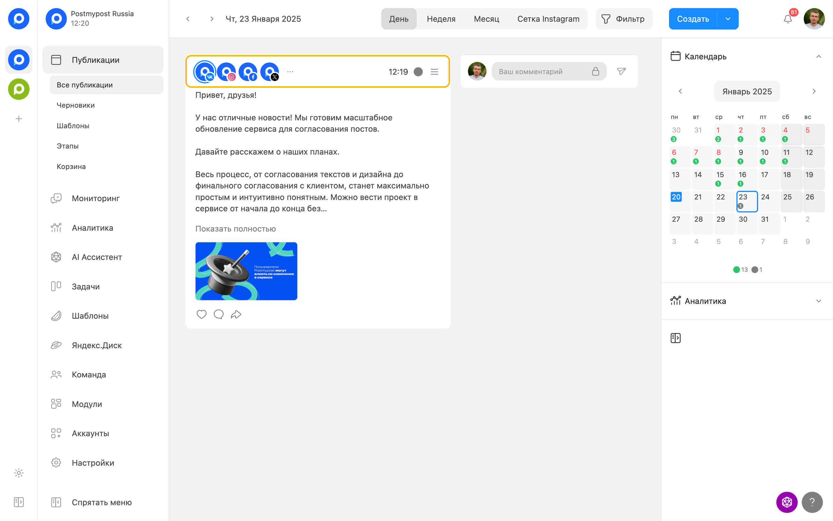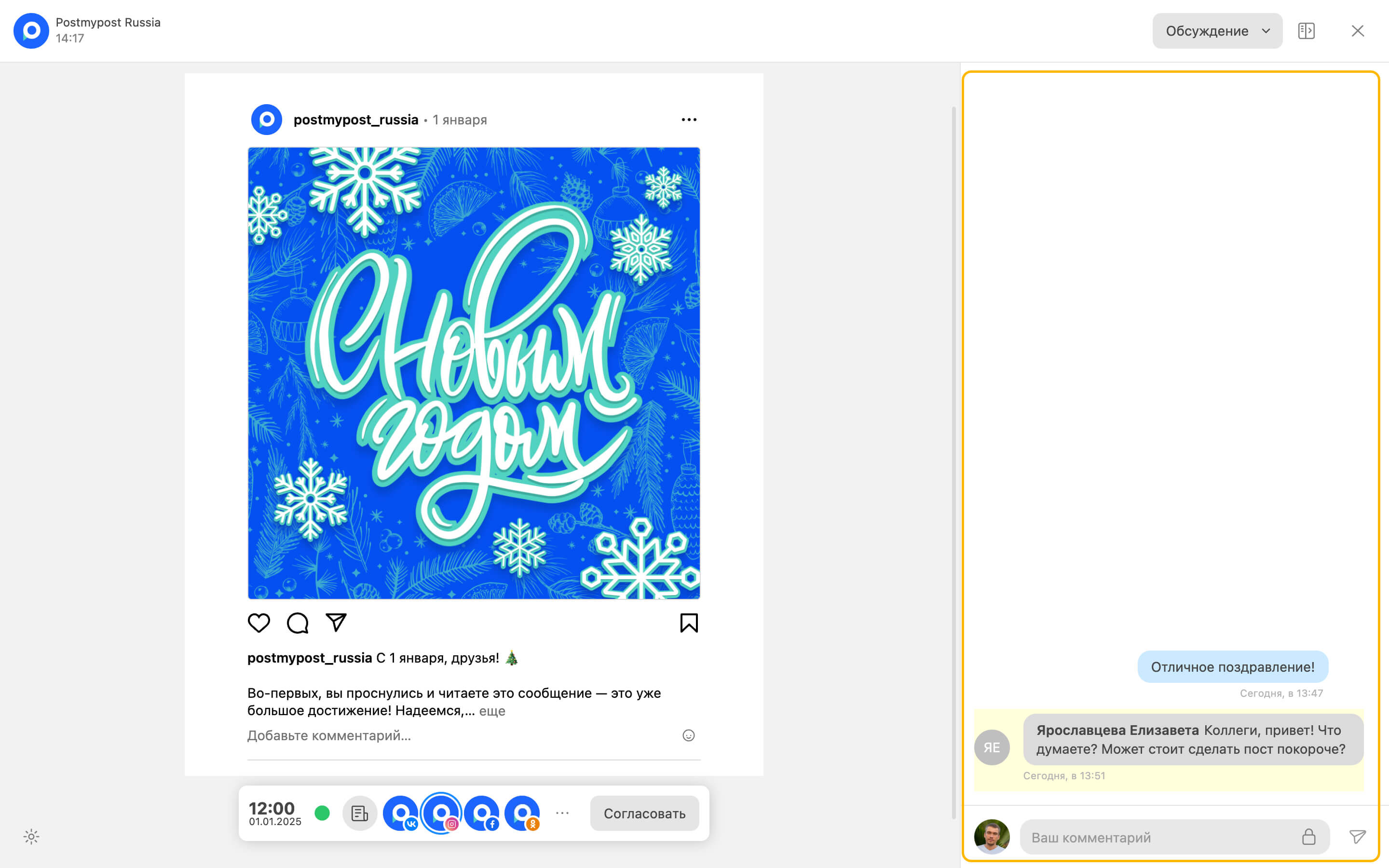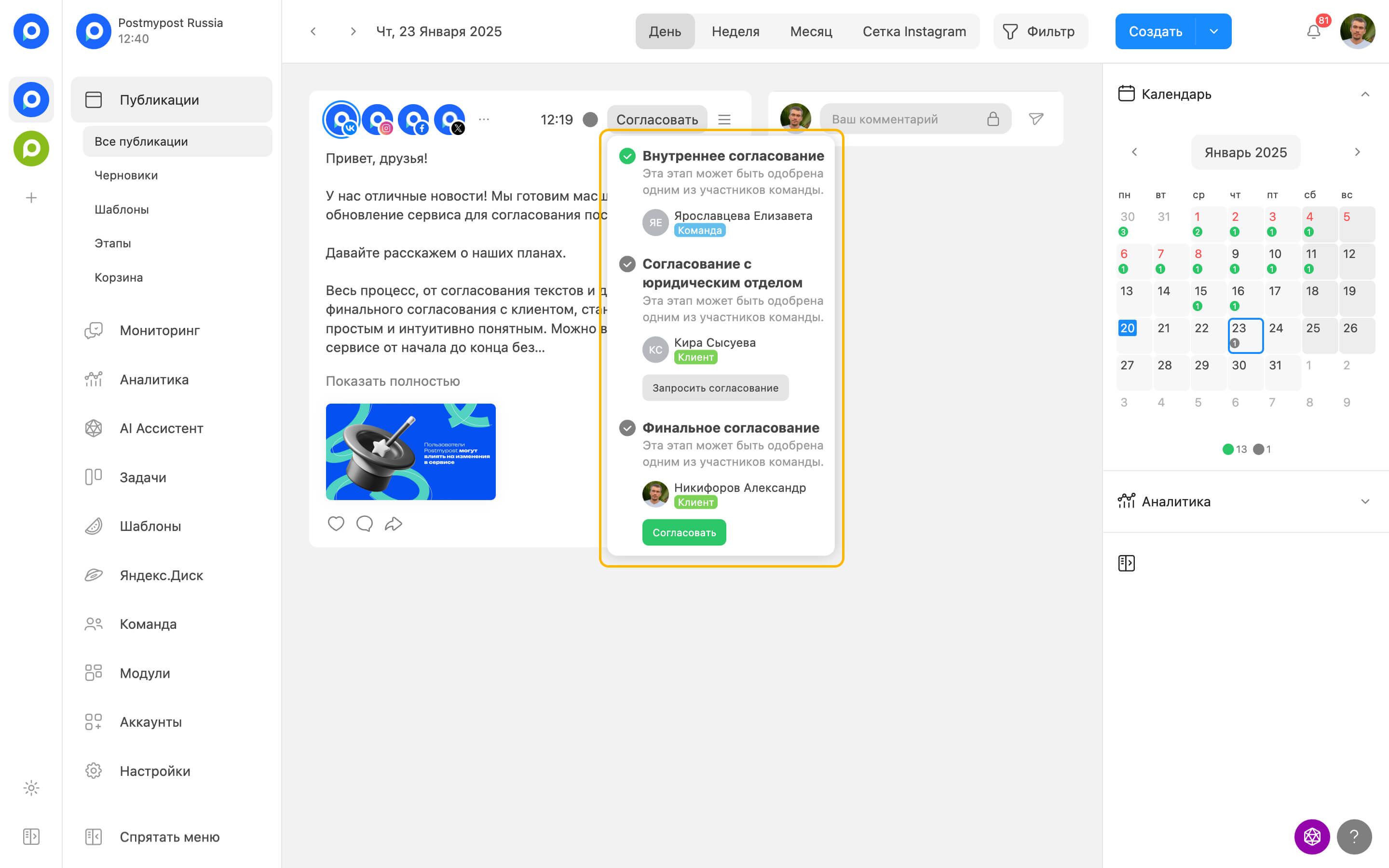 Келісім кезінде Postmypostтағы посттар әлеуметтік желілерде қалай көрінетінін мүмкіндігінше жақын түрде көрсетіледі. Бұл мәтіндегі, визуалды ресімдеудегі және форматтаудағы мүмкін болатын қателерді алдын ала анықтауға көмектеседі, бұл келісім процесін оңайлатып, оны ыңғайлы және мөлдір етеді.