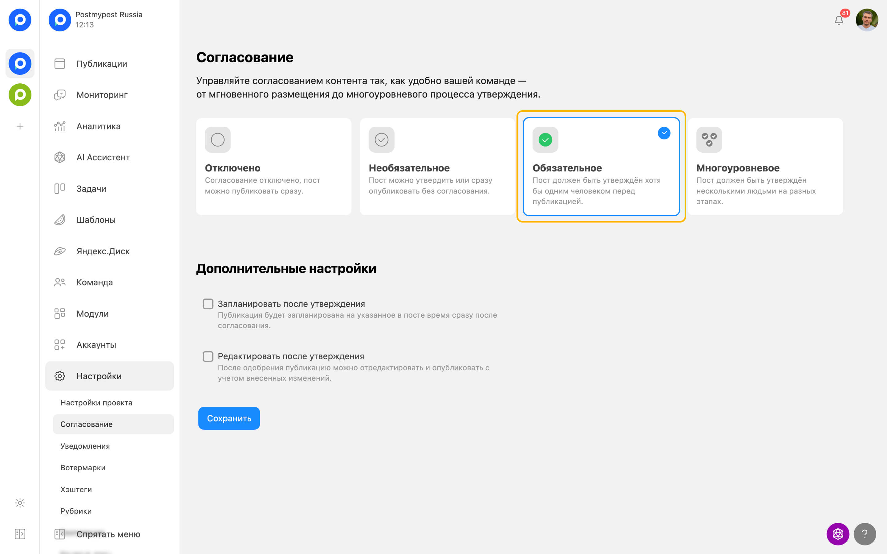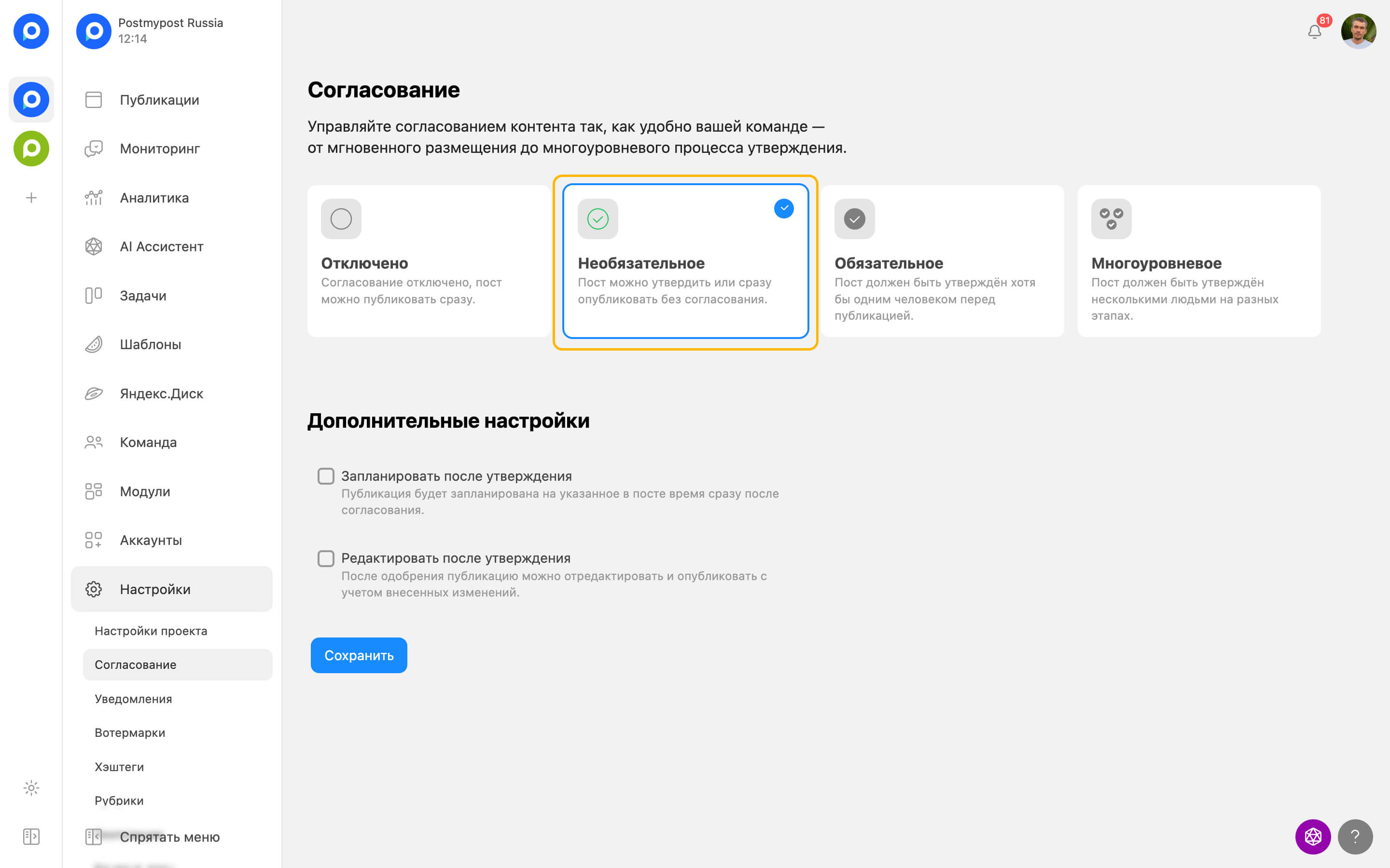 Мысалы, егер сізге тек маңызды ақпаратты келісу қажет болса, сіз әріптестер немесе басшылардан растау ала отырып, мұны жасай аласыз. Бұл мазмұнның сапасын бақылауды шынымен қажет болған жағдайда сақтауға мүмкіндік береді. Екінші жағынан, егер сіз өз материалыңызға сенімді болсаңыз және жылдамырақ әрекет еткіңіз келсе, посттарды мақұлдауды күтпей-ақ жариялау мүмкіндігі бар.