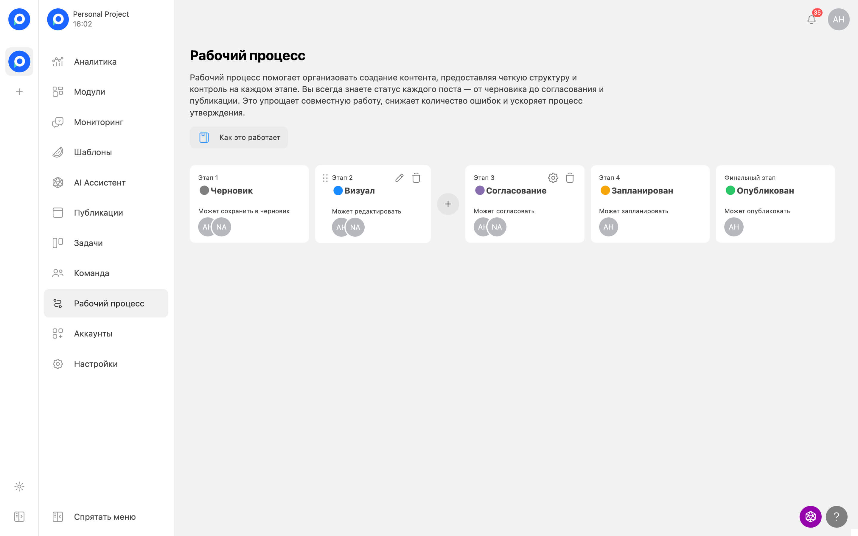 - Өз жұмыс процесіңізді орнату — контентпен жұмыс істеу кезеңдерін құрып, оларды орнатып, идеядан жариялауға дейінгі барлық кезеңдерде оның орындалуын басқару.
