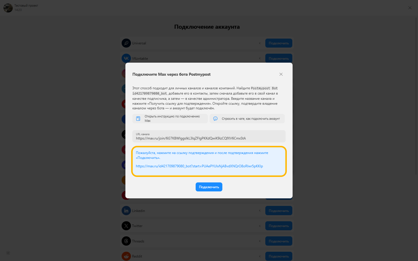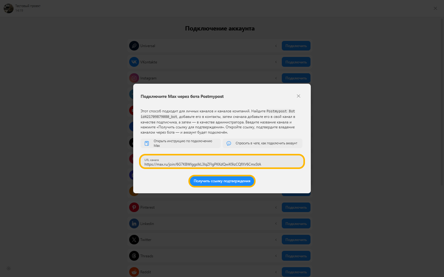 Следуйте этим шагам, чтобы подключить ваш канал в MAX через бота Postmypost.
