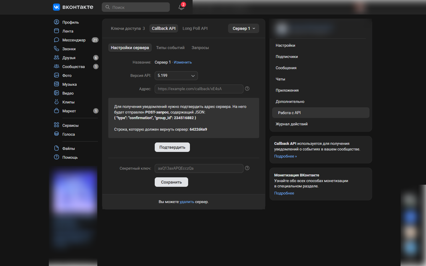 - Проверьте текущие Callback API серверы в настройках вашей группы ВКонтакте: